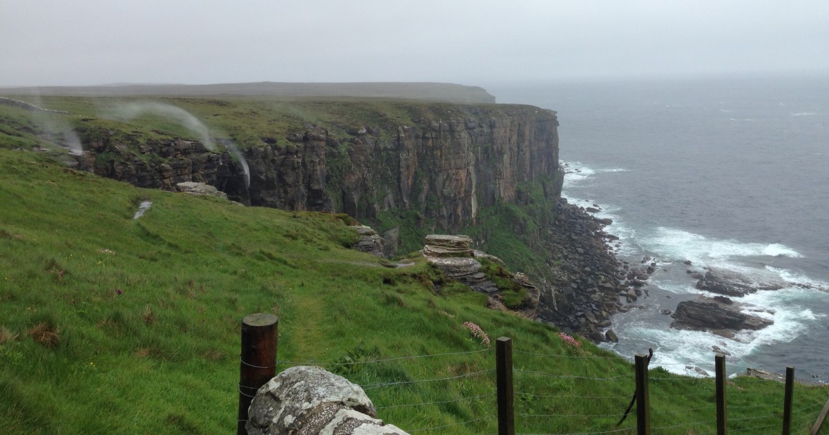 IMG-1414 Published June 22, 2017 at 3264 × 1712 in WALK 38 : ALONG THE NORTH COAST OF SCOTLAND: FROM JOHN O’GROATS TO TONGUE. Next → Dunnet Head. Gale force winds blowing waterfalls back up the cliff.