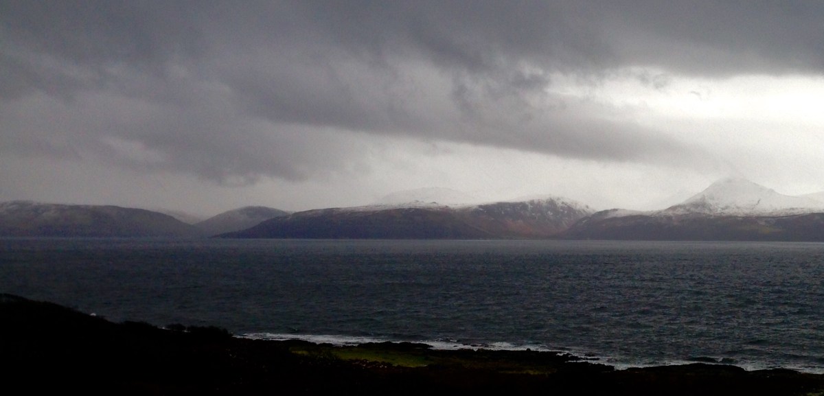 IMG-1697 Published February 7, 2018 at 2310 × 1112 in WALK 47 : SCOTLAND: FROM TARBERT TO CAMPBELTOWN & THE MULL OF KINTYRE, AND BACK TO TARBERT. ← Previous Next → What a difference a day makes! Near Claonaig on the east side of the Kintyre peninsula, looking towards the Isle of Arran.